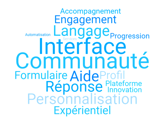 Grâce aux ateliers, nous avons poussé l’innovation et la transformation numérique pour améliorer l’expérience utilisateur de la demande d’admission. Plusieurs activités ont eu lieu pendant les 3 heures de chaque atelier : atelier de vision (proposition de valeur), recadrage (jeune/personne âgée et payer 1 000 $/service en 2040), triage des idées et un exercice de sketch d’interface (papier). Au total, c’est 20 participants aux ateliers de design! Plusieurs thèmes récurrents sont ressortis à la suite des activités tenues avec l’équipe registrariat et les étudiants (voir image de mots).