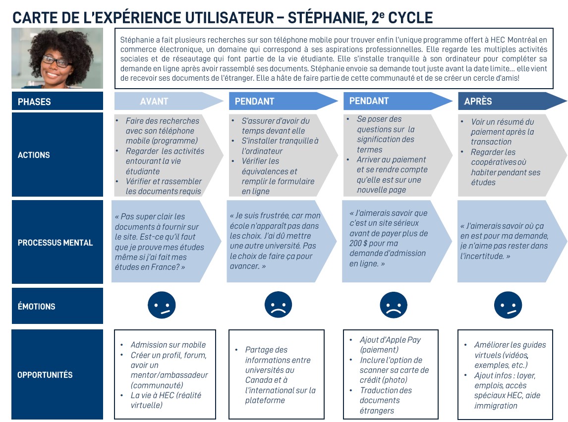 J’observais leur parcours utilisateur actuel, tout en leur posant des questions sur leurs frustrations quant au processus, leur perception générale, leurs émotions au point de vue de l’expérience globale, en plus de recueillir leur vision sur ce à quoi ressemblerait la demande d’admission en ligne pour eux dans le futur. À la suite de ces entrevues, des personas et des parcours utilisateurs ont été conçus.