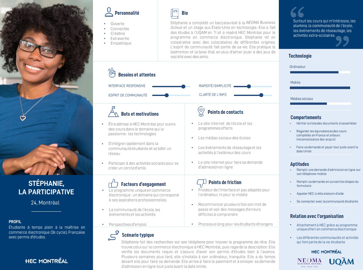 Les objectifs globaux de revoir l’expérience utilisateur de la demande d’amission en ligne de HEC Montréal étaient : offrir aux étudiants une expérience conviviale simple et rapide, permettre aux employés administratifs de traiter les demandes d’admission efficacement et rapidement, récolter une information juste et exhaustive pour verser une décision d’admission, assurer la sécurité de l’information recueillie, en plus de valoriser l’image de HEC Montréal.