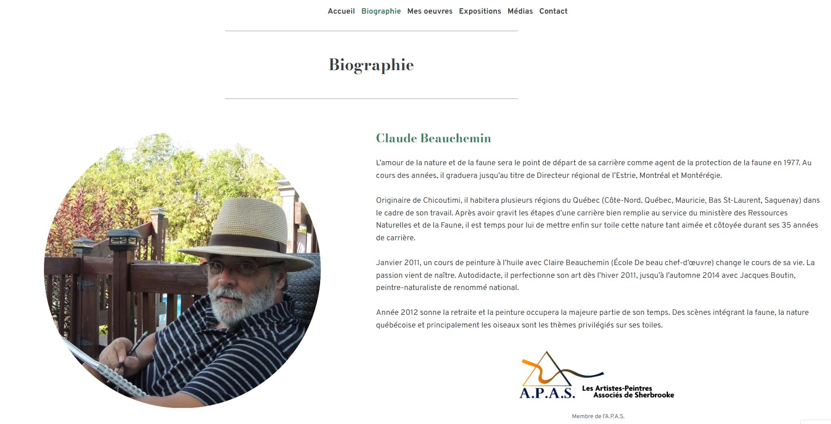 En juin 2021, j’ai conçu un nouveau site web pour l’artiste peintre de Sherbrooke Claude Beauchemin. Anciennement hébergé sur le site simplesite.com, le site web de l’artiste avait besoin d’être mis à jour pour être plus convivial, simple à utiliser et moins coûteux.