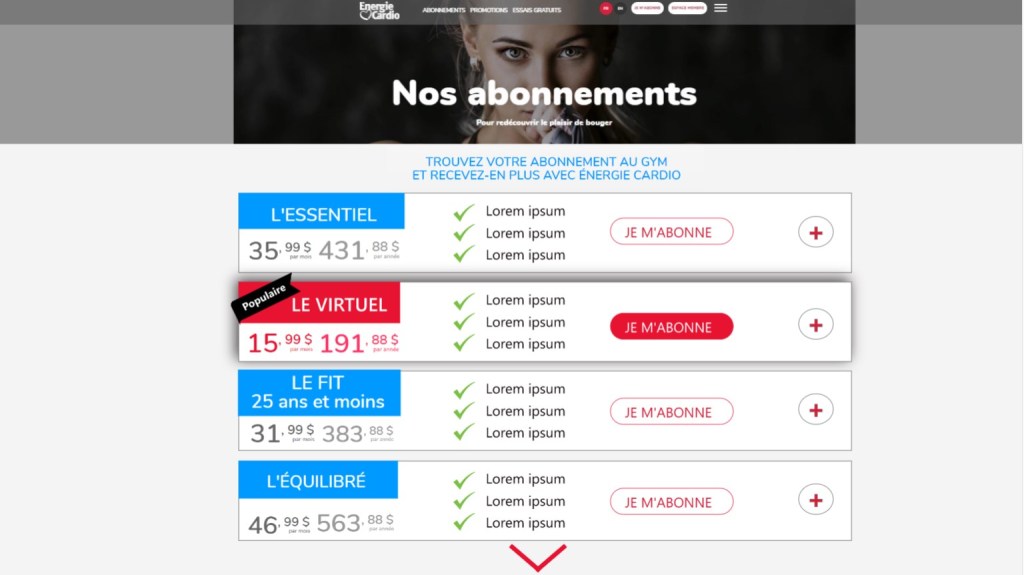 Dans le cadre d’une analyse d’un cas fictif (Énergie Cardio) pour une agence à Montréal, j’ai eu à documenter ma méthodologie UX, ainsi qu’à réaliser des maquettes rapides sur Adobe XD en incluant mes recommandations afin que le site puisse atteindre une augmentation du nombre d’abonnements.