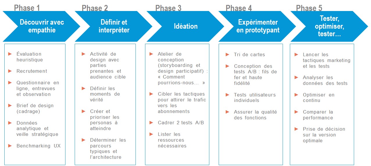 Pour atteindre l’objectif fictif d’Énergie Cardio, alors j’ai proposé à l’agence de décortiquer la mise en place de l’optimisation de l’interface web en plusieurs étapes. Les phases ont été découpées de cette manière : découvrir avec empathie, définir et interpréter, l’idéation, expérimenter à l’aide de prototypage, puis tester les interfaces auprès des clients et optimiser en continu.