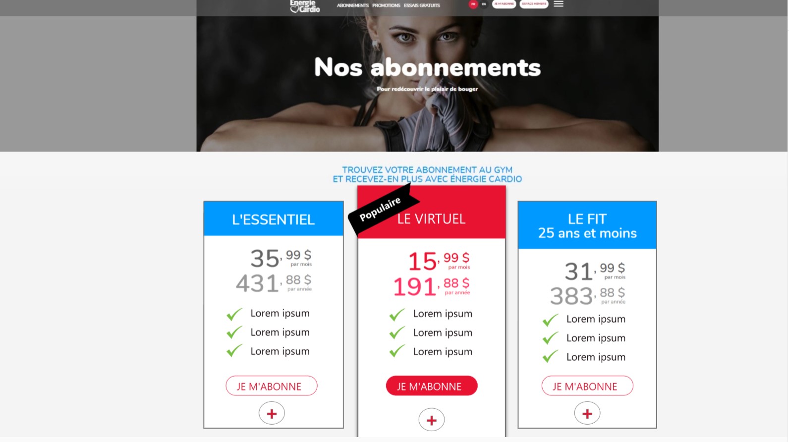 Dans le cadre d’une analyse d’un cas fictif (Énergie Cardio) pour une agence à Montréal, j’ai eu à documenter ma méthodologie UX, ainsi qu’à réaliser des maquettes rapides sur Adobe XD en incluant mes recommandations afin que le site puisse atteindre une augmentation du nombre d’abonnements.