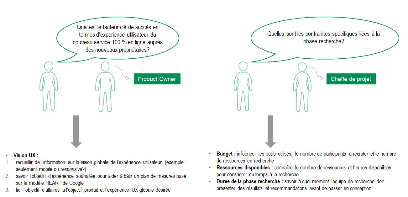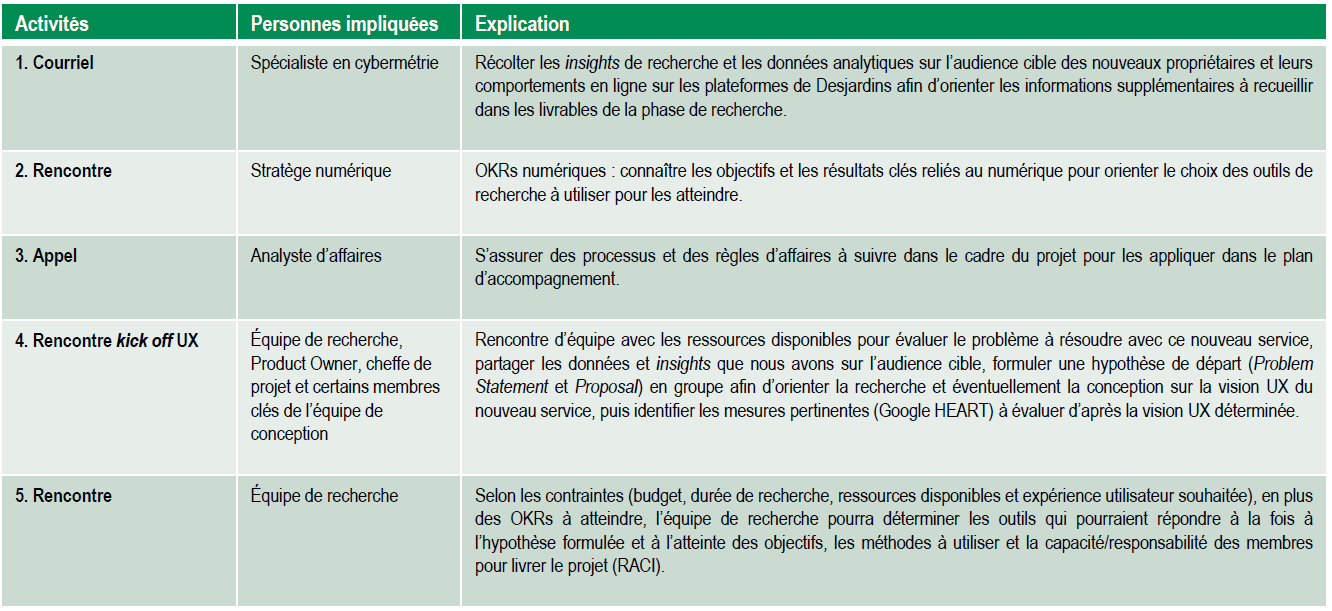 En plus de la méthodologie de recherche, j’avais comme mandat de présenter les conditions gagnantes, les informations requises et les livrables attendus si je devais faire un plan d’accompagnement de recherche pour des parties prenantes. Question de les sensibiliser à la valeur du UX et comment s’en servir de manière optimale!