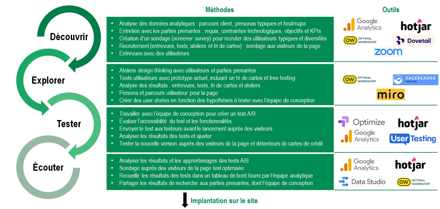 Il est essentiel d’allier la méthodologie qualitative et quantitative de manière intégrée pour ainsi maximiser la cueillette d’insights solides afin d’identifier les principaux irritants et les pistes d’amélioration d’optimisation du comparateur de cartes de crédit en ligne dans le but d’accroître le taux de conversion en ligne. Les méthodologies sélectionnées sont les suivantes :