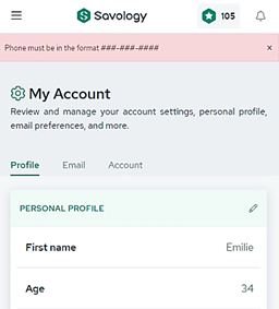 - Correspondre aux attentes : Il faudrait indiquer clairement qu’une erreur s’est produite pour le numéro de téléphone (ci-dessous dans le formulaire) près du champ exact où l’erreur s’est produite dans le contexte du formulaire d’information sur le profil, au lieu d’afficher cette erreur en haut de page.