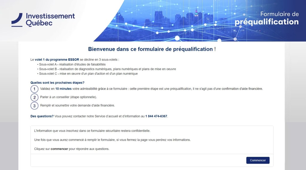 Dans le cadre de mon mandat en expérience client et utilisateur chez Investissement Québec, j’ai participé à l’amélioration UX du formulaire de préqualification pour les entrepreneurs ayant besoin d’une aide financière. Avec le soutien de l’expert lead du projet, j’ai pu transmettre mes connaissances et bonnes pratiques en UX afin d’optimiser la mise en ligne de ce formulaire de préqualification au programme Essor 1.