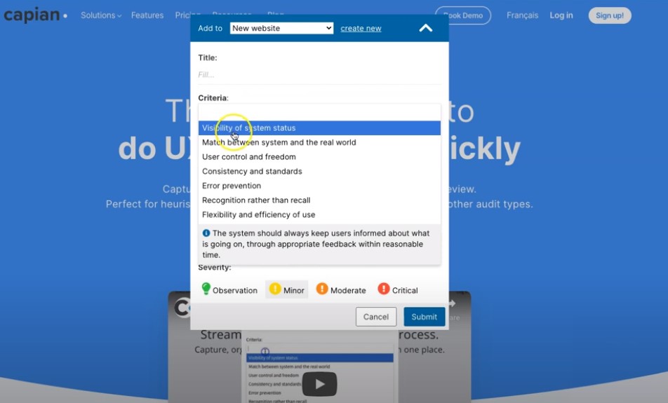 C’est en 2019, dans un cours de design UX à HEC Montréal, que j’ai découvert Capian, ce fabuleux outil pour faire des audits ergonomiques, évaluations expertes et heuristiques UX. Avec cette plateforme, il est facile et rapide, comme designer UX, propriétaire de produit ou consultant, d’effectuer une analyse des interfaces numériques. Il suffit de s’inscrire sur la plateforme (un essai gratuit est disponible!), de créer un projet d’audit, puis de choisir les types de critères à utiliser pour rédiger vos recommandations.