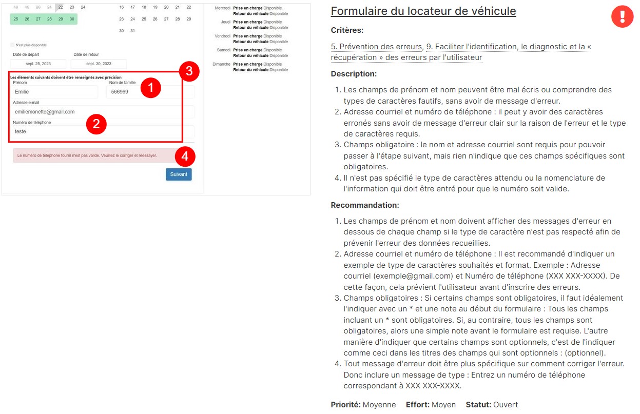 Une fois les critères choisis, vous êtes prêts à passer en revue les interfaces d’une application ou d’un site web par exemple, à l’aide de vos saisies d’écran. Si vous voyez plusieurs problèmes dans une même page, il est alors pertinent d’utiliser des numéros pour identifier les différentes problématiques dans la description. Alors, pour chaque problématique, il est recommandé de proposer des pistes d’amélioration pour aider le client (ou votre entreprise) à améliorer l’expérience utilisateur.