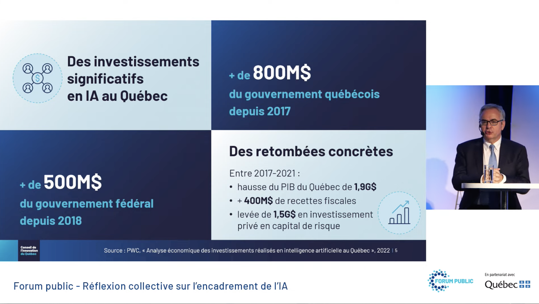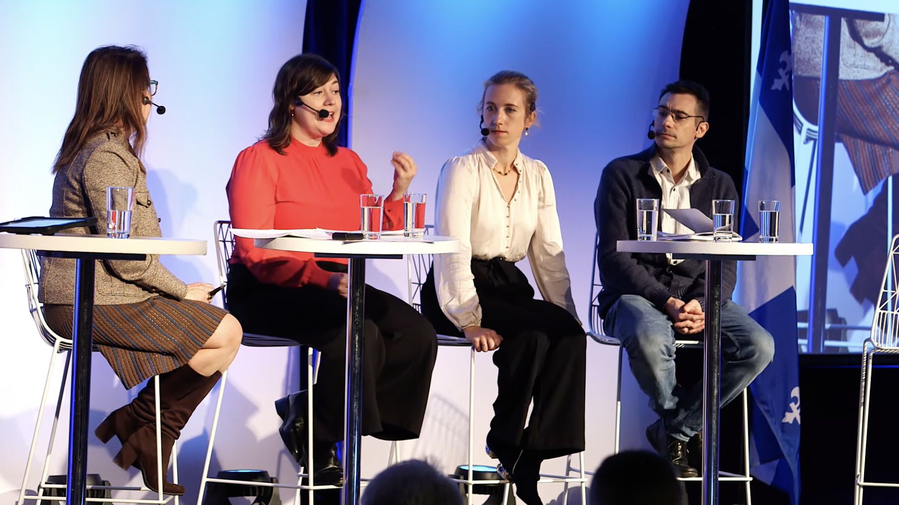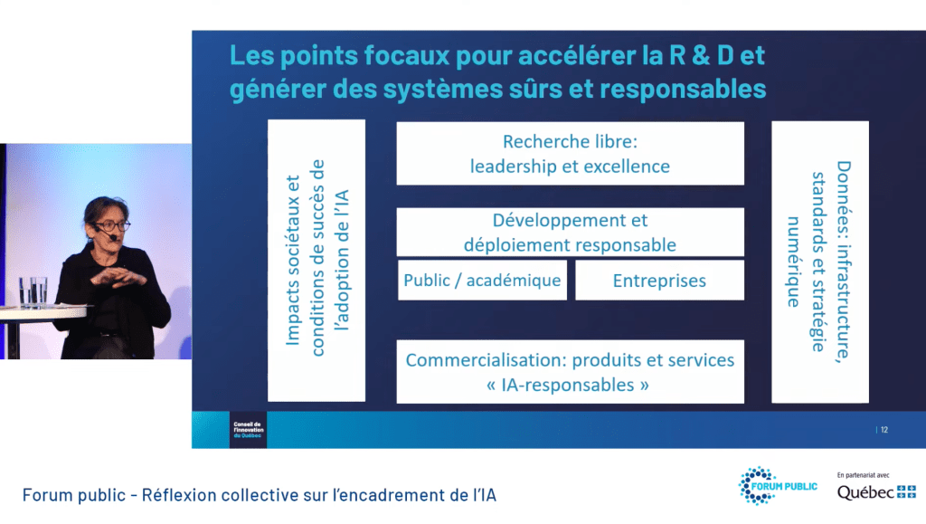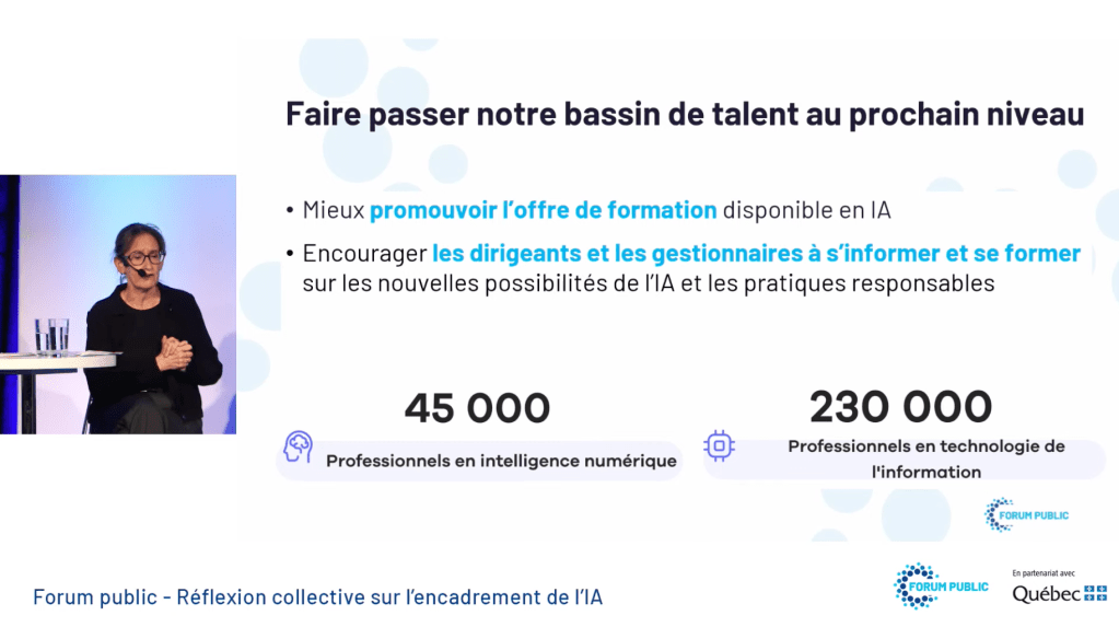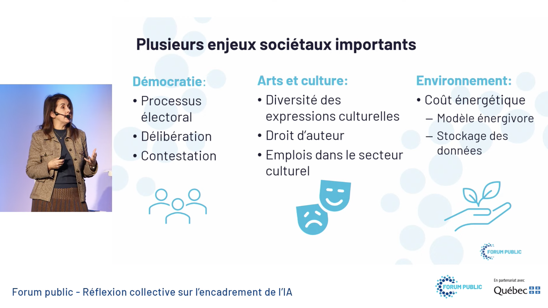 Que ce soit en culture, en environnement ou entourant la démocratie, de multiples enjeux ont été soulevés lors du panel, avec entre autres Marie-Julie Desrochers de la Coalition pour la diversité des expressions culturelles, François Boucher de la Commission de l’éthique en science et technologie, puis Sacha Luccioni de Hugging Face.