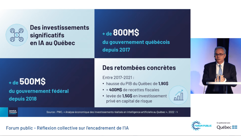 C’est le 2 novembre dernier qu’avait lieu le grand forum sur l’intelligence artificielle (IA) organisé par le Conseil de l’innovation du Québec. Une journée remplie de panels, de discussions riches et de présentations en direct sur le Web réunissant divers secteurs, alimentant ainsi la « réflexion collective qui contribuera à définir les enjeux et les opportunités associés à l’IA afin d’assurer son développement et son utilisation éthique et responsable » (Conseil de l’innovation du Québec). Vraiment pratique cette formule en ligne, parce que j’ai pu joindre le travail, l’apprentissage et ma passion pour l’innovation en même temps… le bonheur!