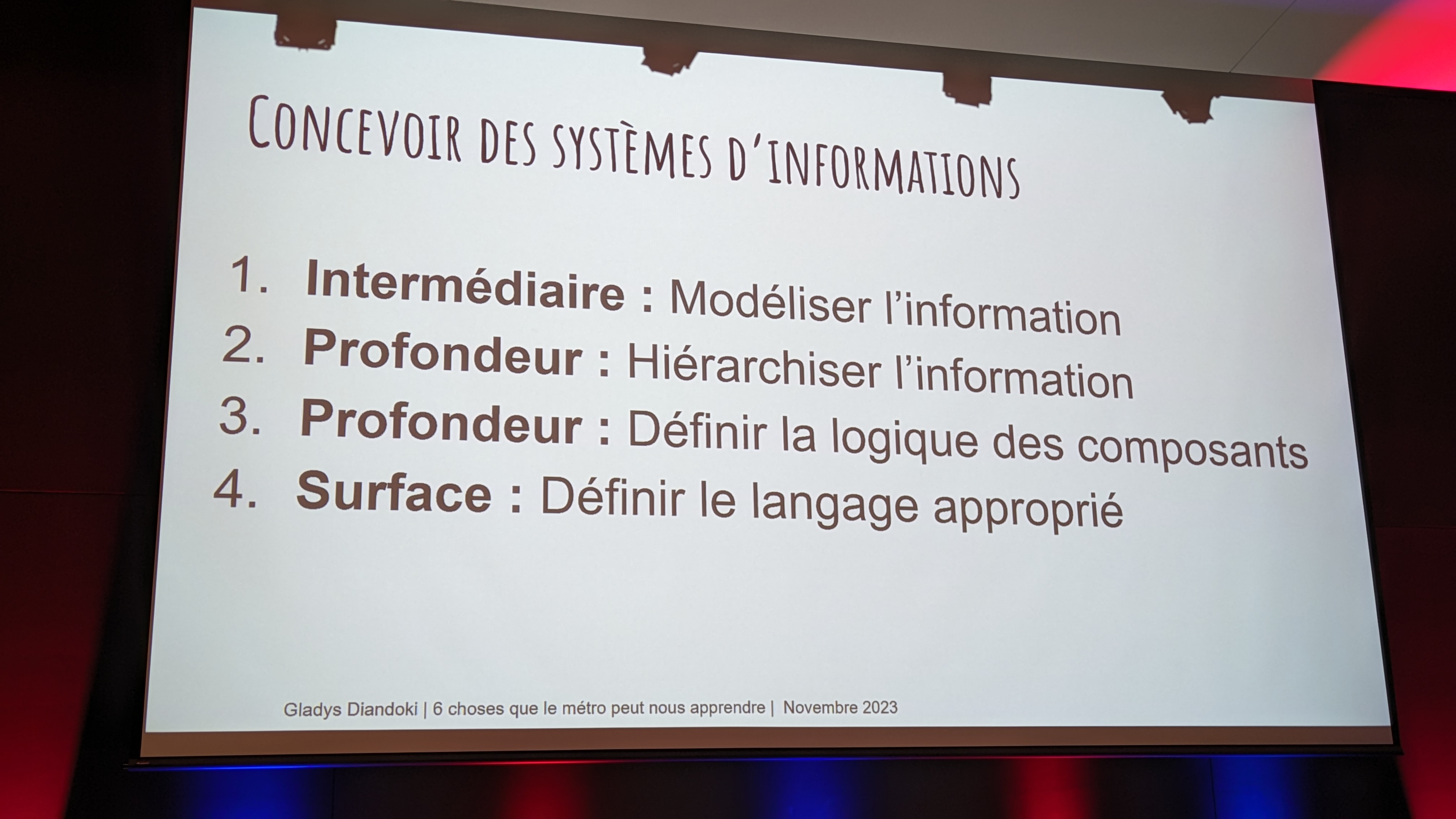 Elle a bâti sa conférence avec un exemple d’application de content design bien montréalais : le métro de Montréal! Le content design, ça consiste à :