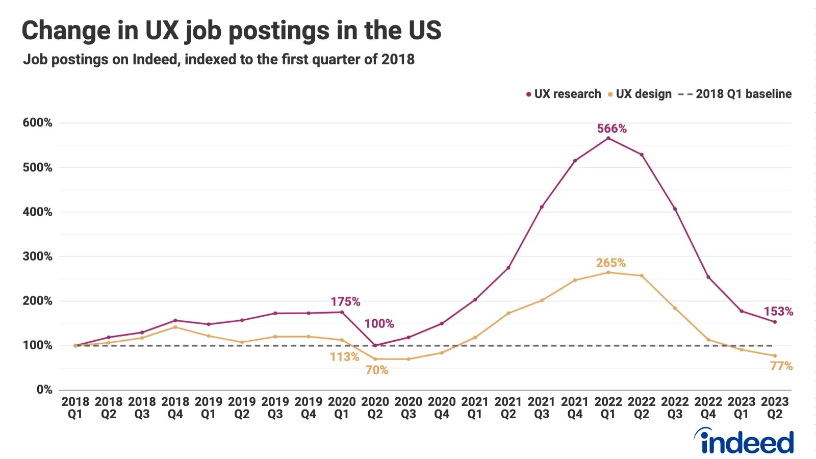 En lien avec cette tendance, l’ouverture de postes dans le domaine de la recherche UX a connu une baisse spectaculaire de 73 % aux États-Unis selon Indeed. Cette diminution drastique des opportunités professionnelles a laissé de nombreux experts de l’UX dans l’incertitude quant à l’évolution de leur carrière. Cette situation s’est aggravée avec d’énormes coupures d’emplois effectuées par les géants technologiques (Meta, Google, etc.), créant de grandes inquiétudes chez les professionnels de l’industrie. Les répercussions ont aussi eu de l’impact au Canada. Cela a engendré des questionnements importants quant à l’avenir de l’UX et à la stabilité de ce marché en constante évolution, surtout depuis le boom de l’intelligence artificielle (IA).