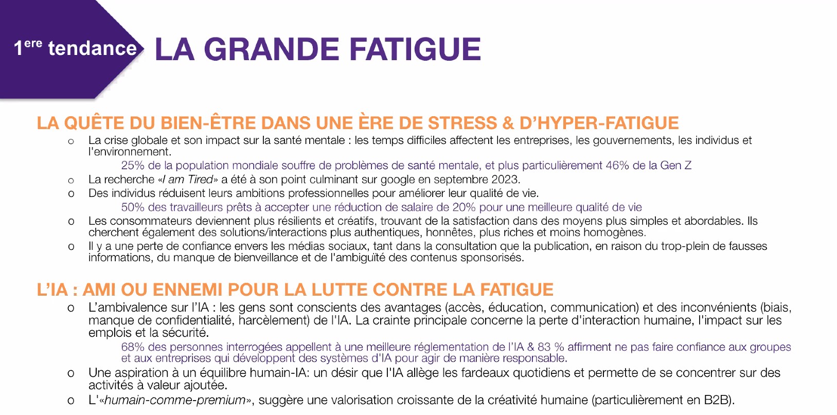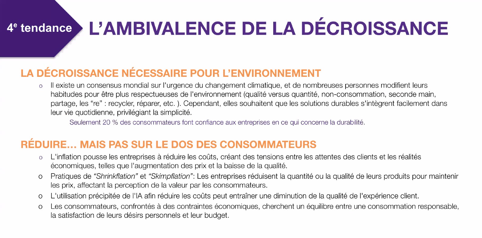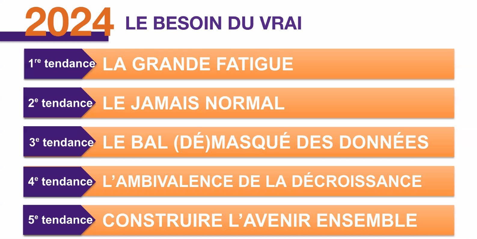 Parmi la documentation feuilletée par le comité CXPA Québec, des thèmes comme le deepfake, les fake news, l’AI vs. Human, les 50 notifications par jour, la véracité des commentaires ou critiques, la shrinkflation, la skimflation, le greenwashing, la désinformation, le théâtre de l’innovation, les influenceurs/contenus sponsorisés ou UGC, l’enshittification et l’ozempic vs. la diète ont émergés. De ces thèmes, le comité a conçu et résumé les tendances en expérience client pour la prochaine année, mais qui vont aussi influencer le futur à moyen et long terme. Les voici en rafale, puis en détails par la suite!