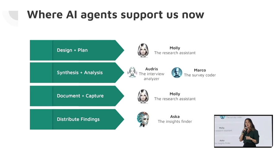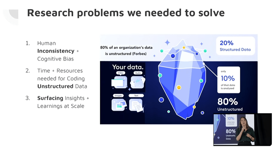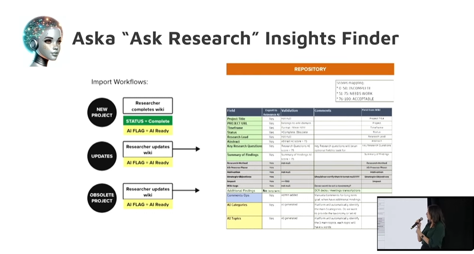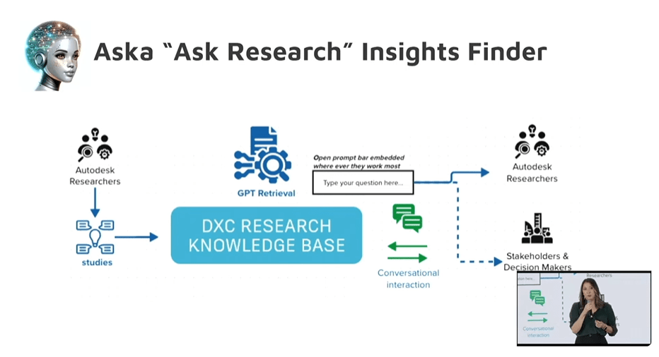 La directrice de la recherche UX chez Autodesk a priorisé la présentation de l’un de leurs modèles, celui d’Aska. Aska peut les aider à trouver des insights précieux dans la base de connaissances de recherche d’Autodesk, ce qui inclus des résumés de résultats, des questions de recherche, et bien plus dans leur vaste collection d’études de recherche. Je crois fermement que des outils d’IA peut nous aider comme chercheur UX à être encore plus efficace dans notre travail. Ceci est un exemple super riche!