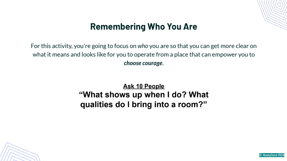 La dernière étape du processus est celle de demander à des proches ce qui ressort sur vous, dans un but de choisir le courage comme mode d’action. Il faudrait demander à 10 personnes : Que se passe-t-il quand je suis là? Quelles qualités j’apporte dans une pièce? Un exercice hyper riche. Cela ressemble beaucoup à l’un des exercices que j’ai eu à réaliser dans un cours sur la gestion de la vie professionnelle à HEC Montréal.