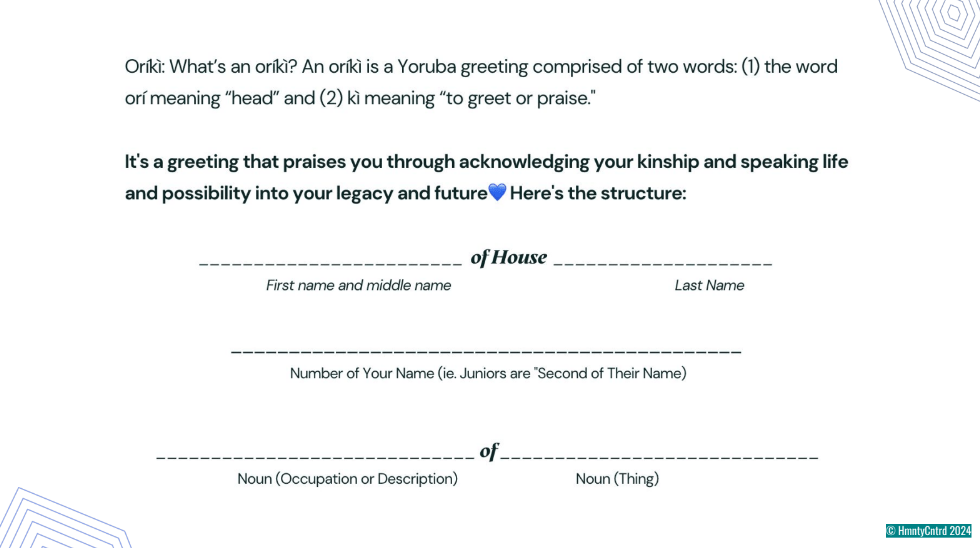 Ensuite, pour continuer l’exercice sur notre relation avec l’espoir est de créer un oriki. Elle nous explique alors ce qu’est un oriki : une salutation yoruba composée de deux mots : (1) le mot ori signifiant « tête » et (2) ki signifiant « saluer ou louer ». C’est une salutation qui reconnaît notre parenté en parlant de la vie et des possibilités dans notre héritage et notre avenir. Vraiment inspirant! Vivianne a alors partagé un exemple de son oriki.