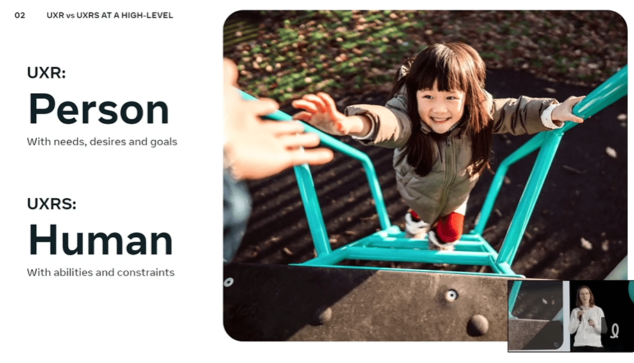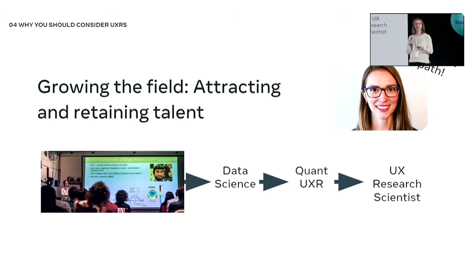 La deuxième conférence a davantage piqué ma curiosité. Pourquoi? Parce que Madeline Huberth, scientifique en recherche UX chez Meta, a partagé une présentation riche sur le rôle de scientifique en recherche UX (UXRS) qui connaît une croissance au sein de Meta. Et peut-être bien dans d’autres organisations dans les prochaines années! En tant que scientifique en recherche UX, Madeline a mis en lumière comment un UXRS se distingue des autres rôles de recherche, les types de compétences nécessaires et a partagé des conseils aux dirigeants et aux chercheurs intéressés envers cette avenue en recherche UX.