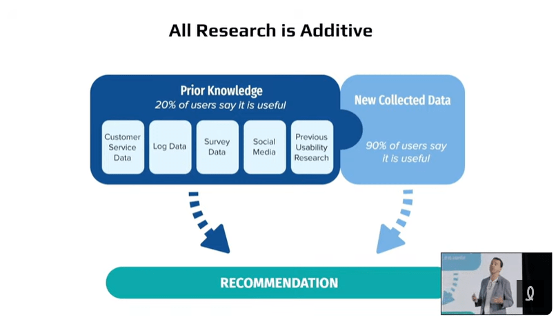 L’important est d’aller chercher plusieurs types de données à la fois quantitatives et qualitatives, d’en dégager des découvertes et résultats probants pour ensuite en retirer des recommandations pour améliorer l’expérience utilisateur. Et chaque recherche s’ajoute aux résultats de recherches précédentes. Les résultats s’ajoutent à d’autres recherches menées, il n’est plus question de recherche en mode « 1 time ».