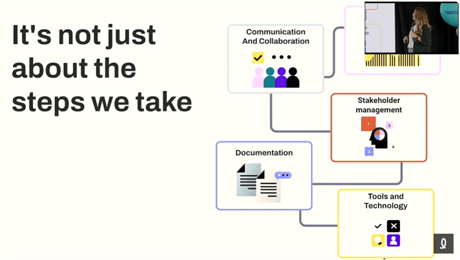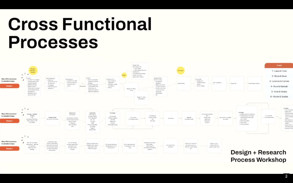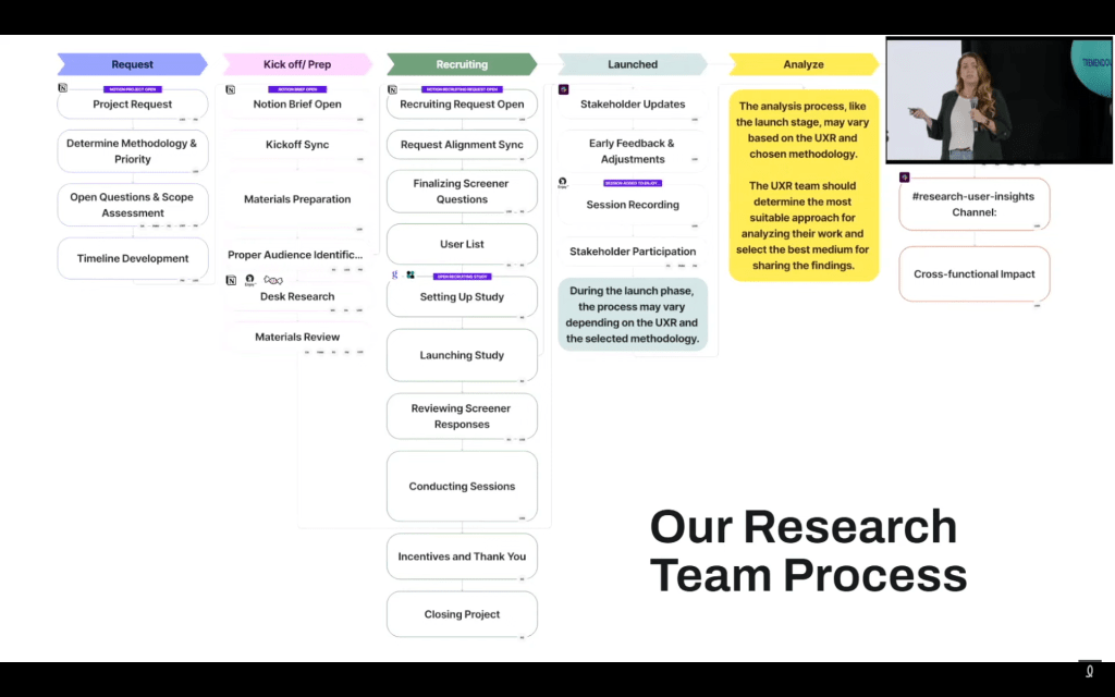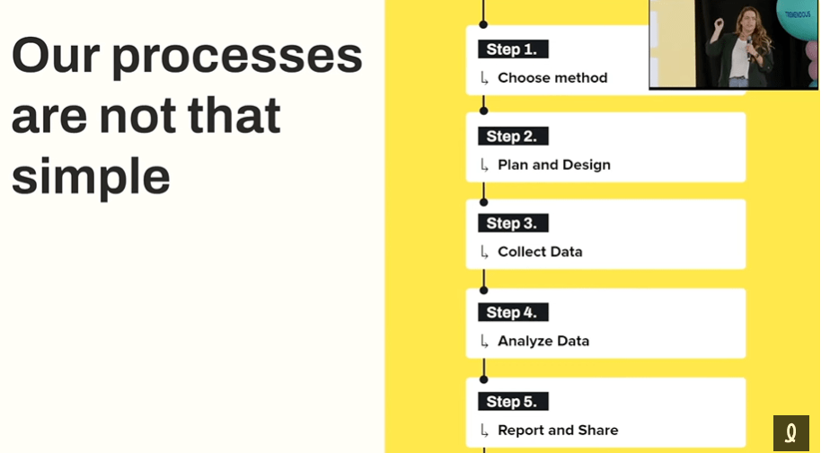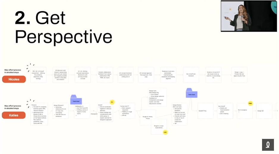 Nicole a bien souligné que les processus ne sont pas seulement une série d’étapes : ce sont des plans pour favoriser l’efficacité et l’impact. Elle a mis en pratique un grand exercice de cartographie des processus avec son équipe de recherche UX, mais aussi avec les autres joueurs clés de l’organisation. Un processus pas aussi simple que cette image de sa présentation.