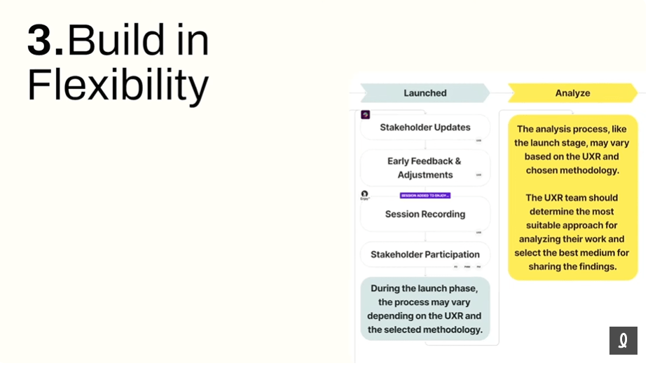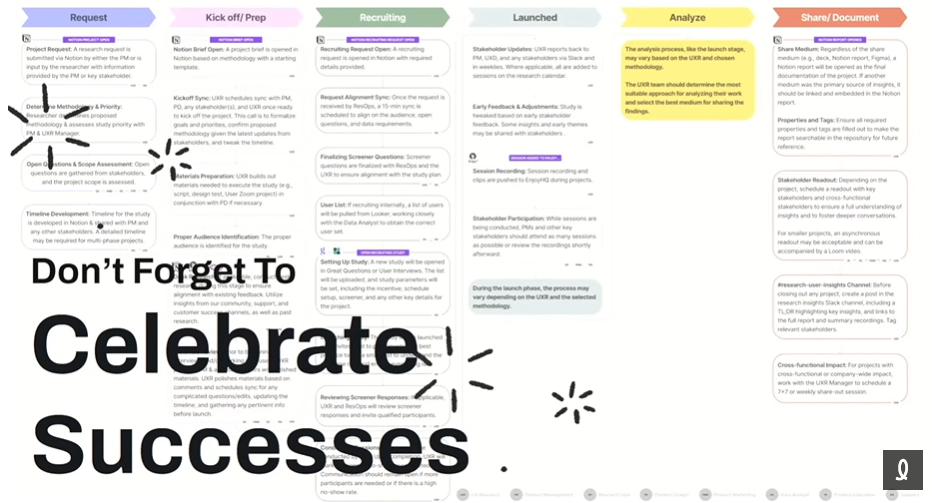 Nicole a généreusement partagé le modèle qu’elle et son équipe ont utilisé pour redéfinir leurs processus de recherche en rappelant que notre travail en tant que chercheur UX implique d’identifier les parties prenantes, le moment où l’étape se situe et comment éliminer les inefficacités. Avec ce genre d’exercice de cartographie des processus, cela nous permet de passer plus de temps à faire de la recherche! Son modèle Figma est disponible ICI.