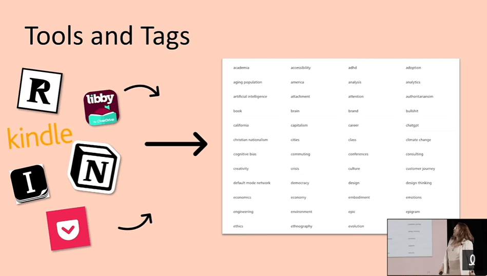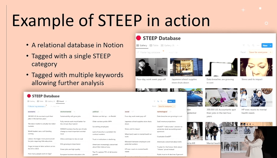 Comme chercheuse UX, j’ai trouvé fort enrichissant sa méthode STEEP pour suivre les évolutions dans de nombreux domaines : social, technologique, économique, environnemental et politique. Comment? Par exemple, en utilisant une base de données relationnelle dans l’outil Notion, en créant une seule catégorie STEEP, puis en ayant plusieurs mots-clés permettant une analyse plus approfondie de ces domaines.