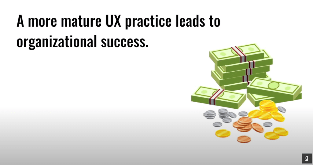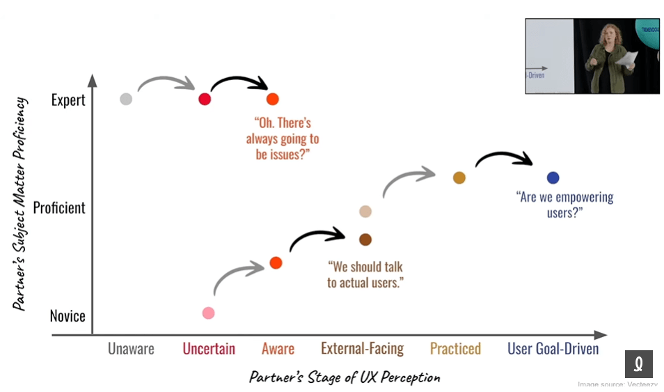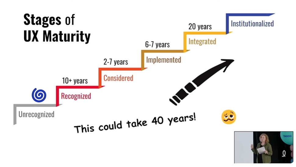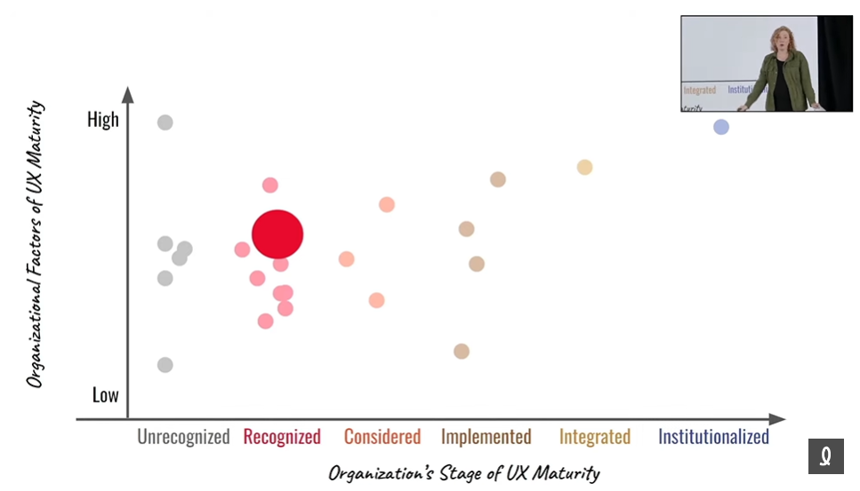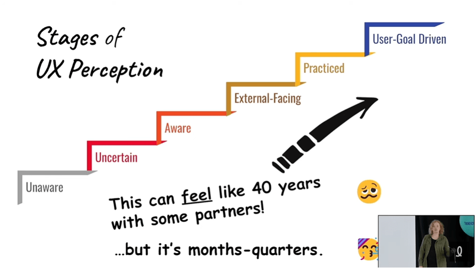 Cette dernière a commencé sa conférence en disant que souvent, on nous demande comme professionnel en UX d’améliorer la maturité UX de l’organisation. Et, en fait, cela peut prendre 40 ans! Ce n’est pas possible d’augmenter rapidement la maturité UX d’une organisation en criant : « ciseau ».