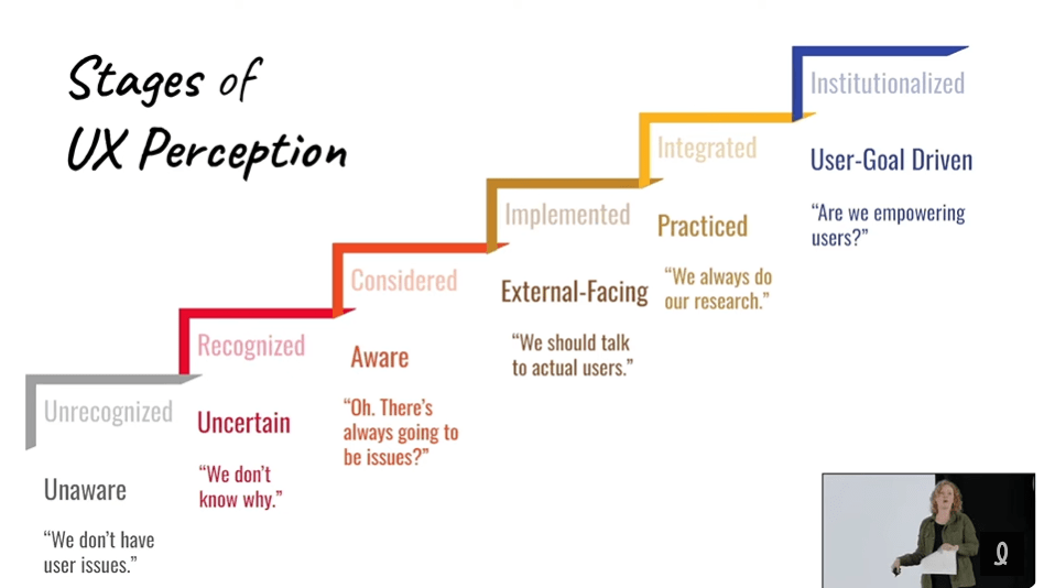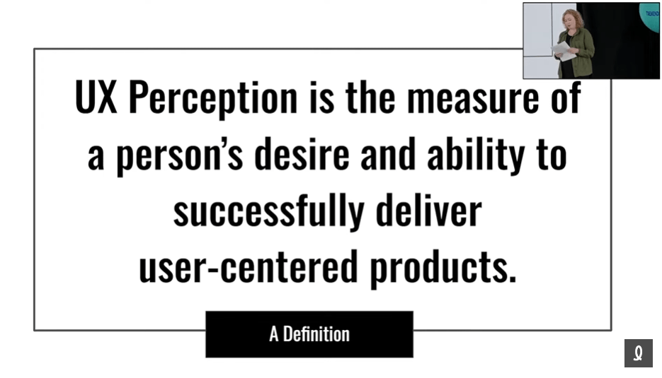 Plusieurs facteurs influencent la maturité UX d’une organisation : les caractéristiques organisationnelles, le budget et les ressources en UX, le leadership UX, la culture, les méthodes de recherche UX, la formation et les compétences des professionnels, les mesures de succès des produits, l’intégration UX au sein de l’organisation et les 1001 défis UX. Alors, ce n’est pas qu’une seule personne qui peut avoir ces responsabilités. La conférencière a alors enchaîné en parlant de la perception du UX à même l’organisation : la perception UX est la mesure du désir et de la capacité d’une personne à livrer avec succès des produits centrés sur l’utilisateur.