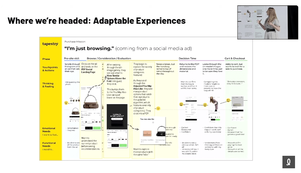 Par la suite, Jennifer Siedjak, directrice de la recherche UX chez Tapestry, nous a captivé sur la façon d’améliorer nos recherches UX sur les parcours clients pour maximiser notre impact sur l’utilisateur et l’entreprise. Il est important de montrer la bonne chose au bon moment aux utilisateurs. Mais que se passerait-il si nous pouvions prédire l’objectif d’un utilisateur et adapter l’expérience en temps réel pour répondre à ses besoins?