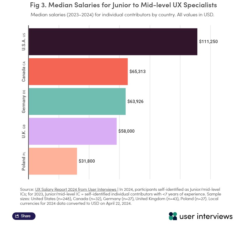 Ce sont alors des dizaines de milliers de recrues UX qui négocieront leurs salaires en 2024. Plusieurs autres designers UX, chercheurs UX, spécialistes ReOps et autres professionnels de l’expérience utilisateur discuteront également de leur rémunération dans le cadre des évaluations de performance ou des révisions salariales.