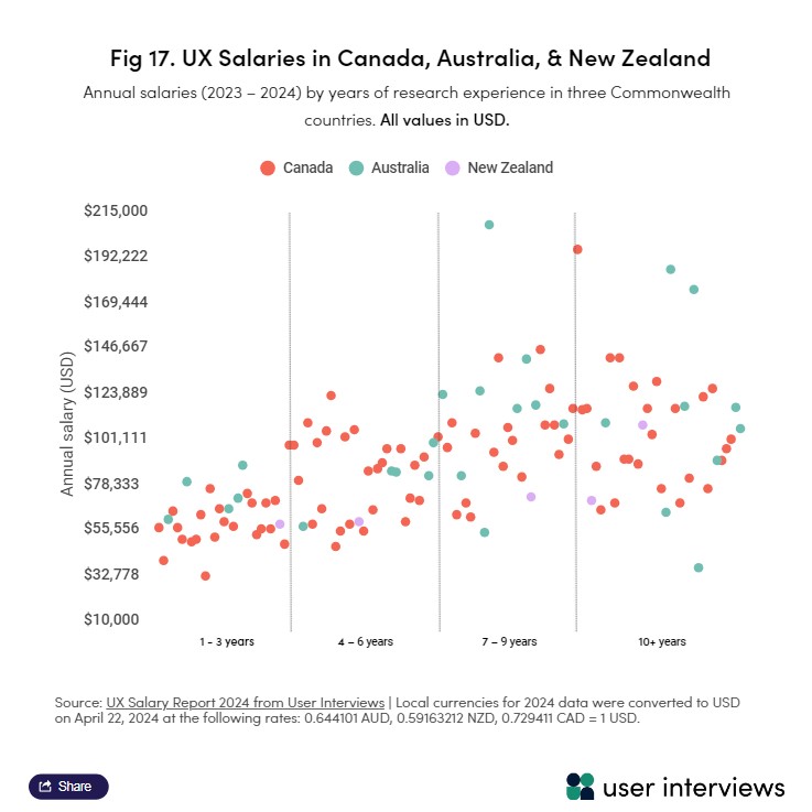 Les salaires UX typiques dans les principaux pays du Commonwealth apparaissent en réalité similaires. Voici maintenant les données salariales UX du Canada, ventilées par années d’expérience.
