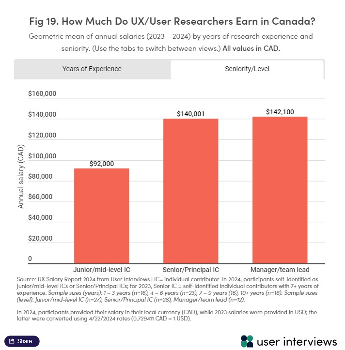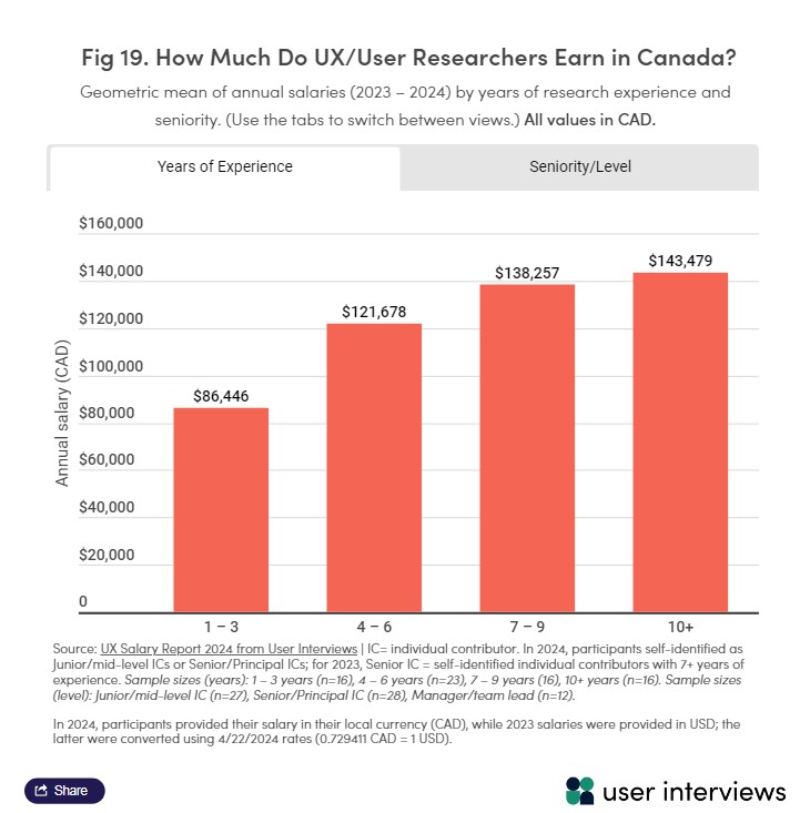 Lorsqu’ils sont ventilés par années d’expérience, les salaires des chercheurs UX au Canada semblent légèrement inférieurs aux salaires de l’expérience utilisateur dans l’ensemble (voir données du rapport en anglais). Vous trouverez ici la représentation des salaires au Canada selon le niveau de séniorité.