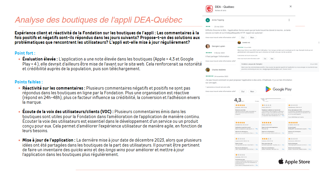 - Des recommandations touchant : SEO, architecture du contenu, bonnes pratiques des formulaires, infolettre, cookies, évaluations clients, accessibilité de l’application, réactivité de la Fondation dans les boutiques, contenu de l’appli et clarté des icônes