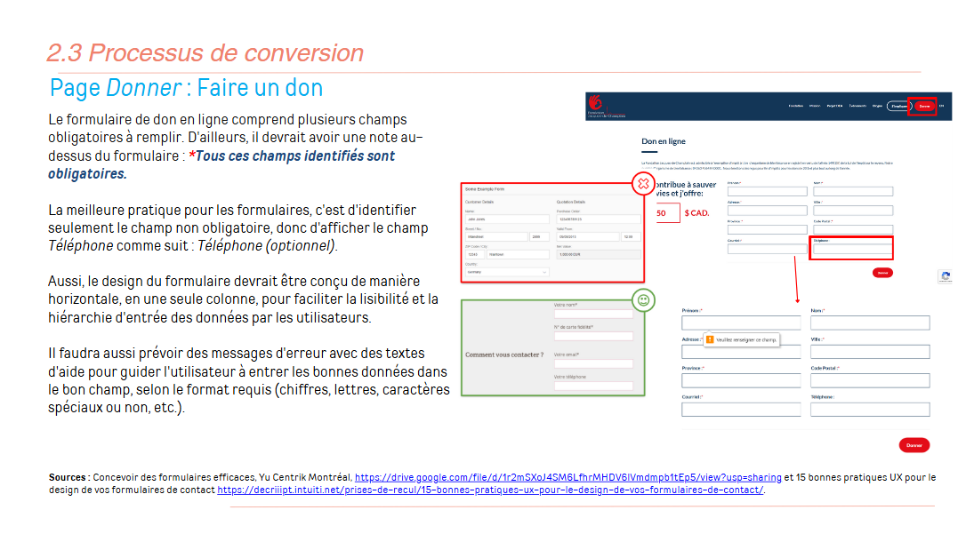 - Des points forts et des points d’amélioration en navigation, formulaire sur le site, SEO, architecture du contenu, bonnes pratiques des formulaires, infolettre, cookies, évaluations clients, accessibilité de l’application, réactivité de la Fondation dans les boutiques, contenu de l’appli et clarté des icônes