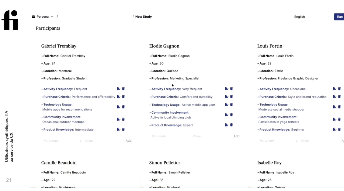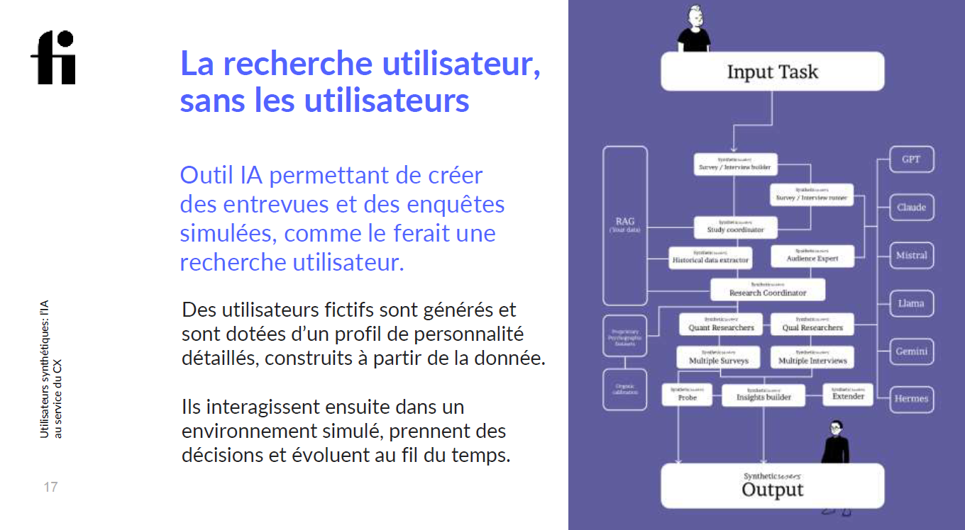 Pour surmonter ces défis, des outils d’intelligence artificielle peuvent simuler des entrevues et des sondages. Ces technologies génèrent des utilisateurs fictifs dotés de profils de personnalité réalistes basés sur des données existantes. Ces agents synthétiques interagissent dans des environnements simulés, prenant des décisions et évoluant en fonction des scénarios étudiés. Noémie a présenté une démonstration des capacités de l’outil Synthetic user. J’étais vraiment impressionnée!