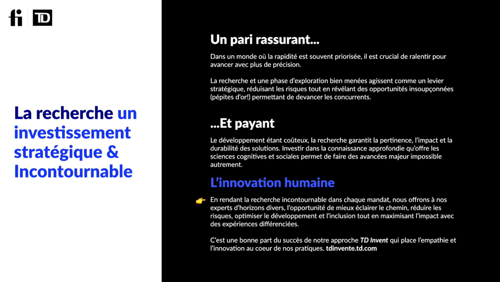 Mathieu a parlé de la recherche et l’importance d’investir dans ce créneau en entreprise, cela m’a tout de suite interpellée! En rendant la recherche incontournable dans chaque mandat chez TD Assurance, ils offrent aux experts d’horizons divers l’opportunité de mieux éclairer le chemin, réduire les risques pour l’organisation, optimiser le développement et l’inclusion, tout en maximisant l’impact avec des expériences différenciées.