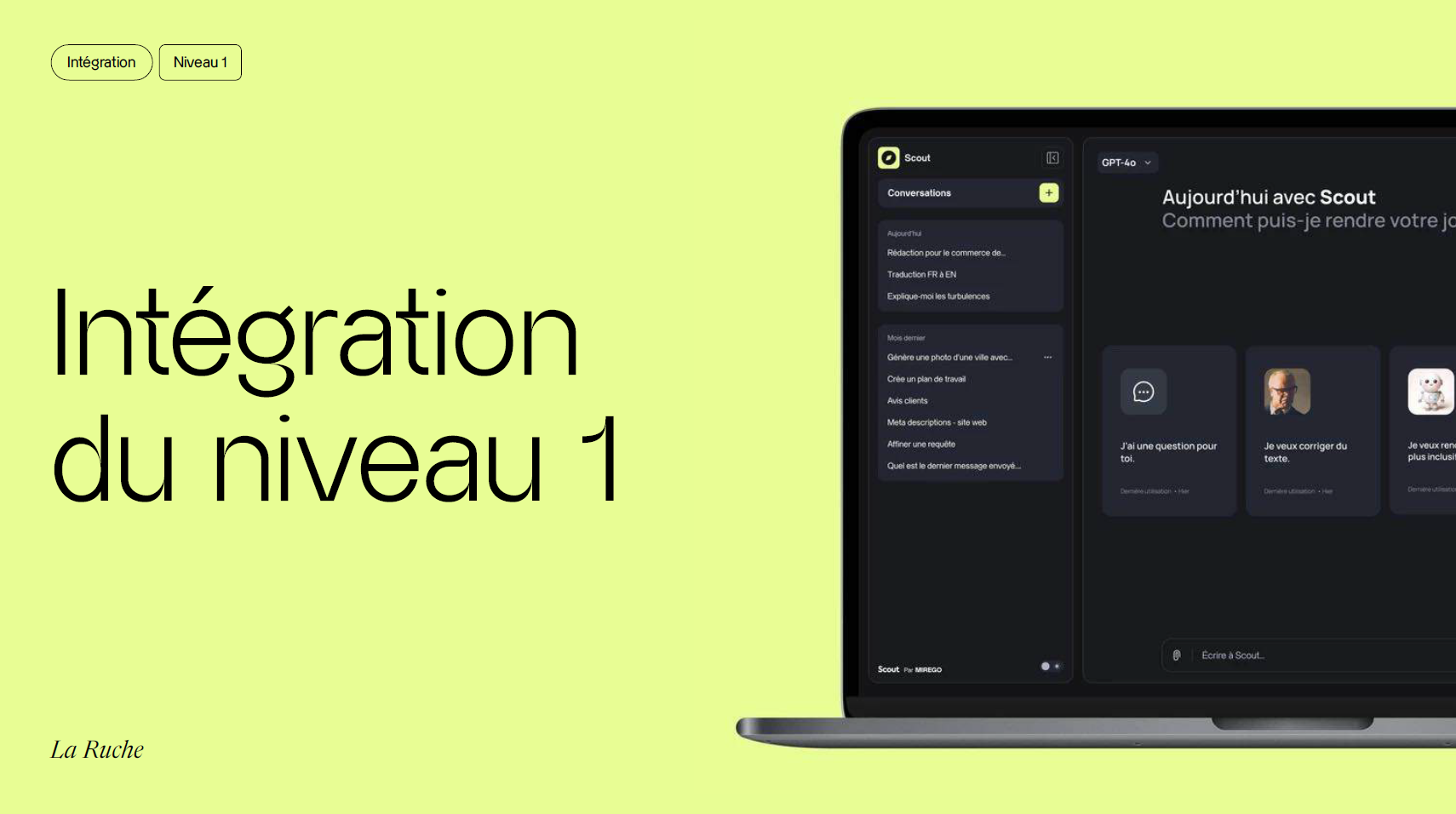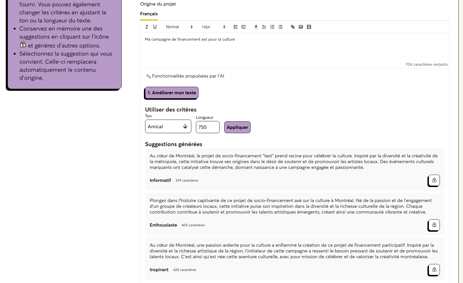 Pour La Ruche, le niveau 1 était celui qui répondait aux besoins. Mirego a donc intégré l’aide à la rédaction et la traduction avec GPT4, puis la génération de texte. Les membres qui démarrent une campagne peuvent ainsi utiliser l’AI dans la plateforme pour rédiger leur description de campagne par exemple, traduire le texte ou en générer, ce qui optimise et simplifie grandement le processus de lancement de la campagne.