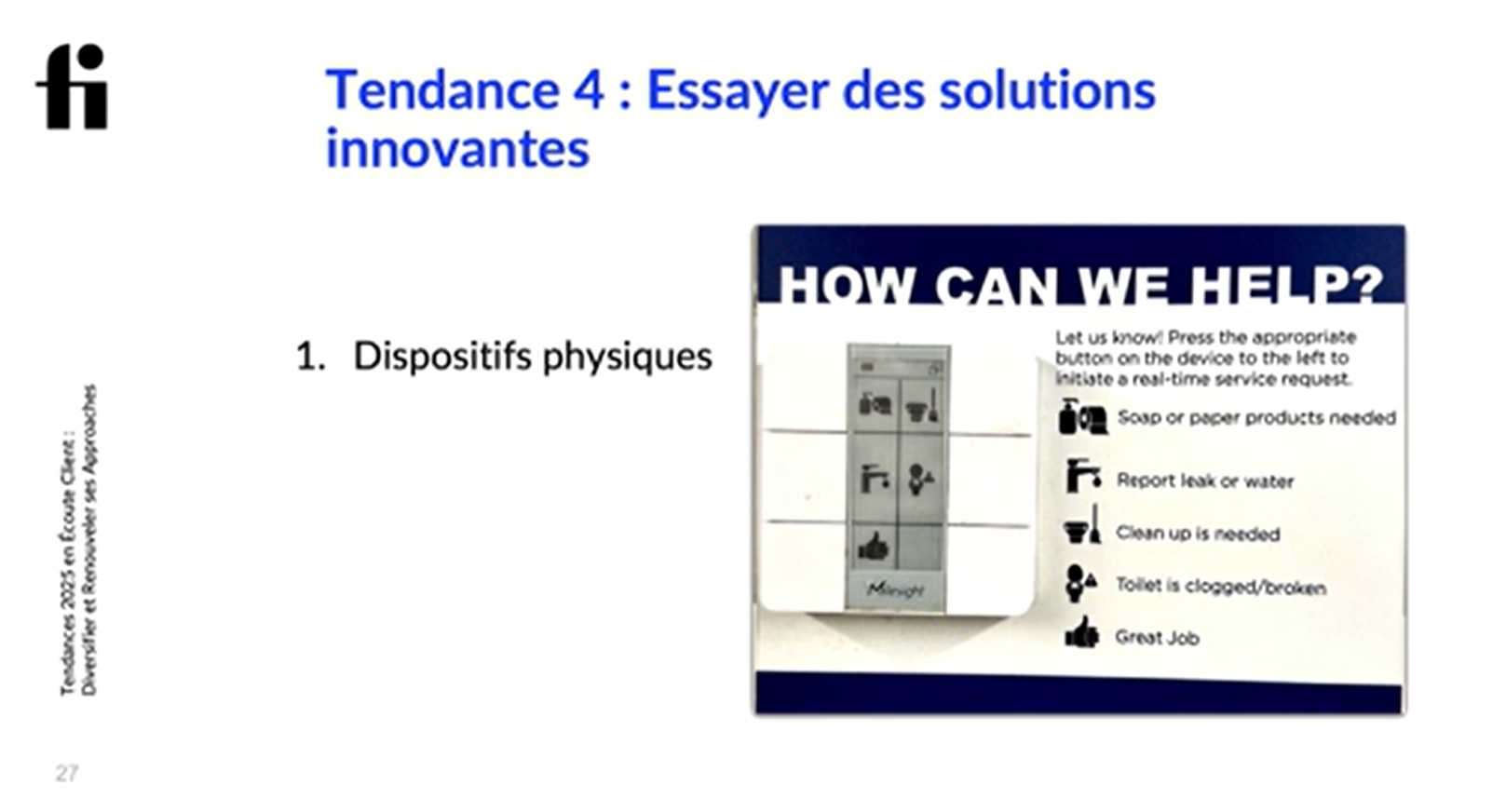 Philippe a mentionné qu’il avait aperçu cet affichage lors d’un voyage, voilà une manière innovante, efficace et « actionable » en expérience client! Au lieu de proposer des bonhommes de satisfaction qui ne veulent rien dire, proposer aux clients de choisir une demande de service précise en temps réel.