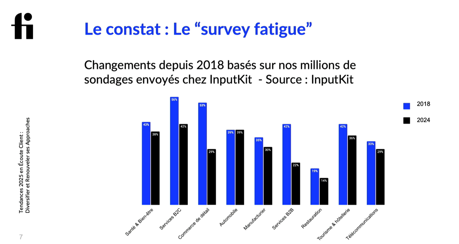 Philippe Genois, président d’InputKit, a partagé ensuite les tendances 2025 en matière d’écoute client. L’enjeu principal? Surmonter la fatigue des sondages en développant des techniques d’écoute passive et d’hyper-personnalisation. Selon les données partagées par Philippe, le taux de réponse aux sondages est passé de 44 % en 2018 à 35 % en 2024.