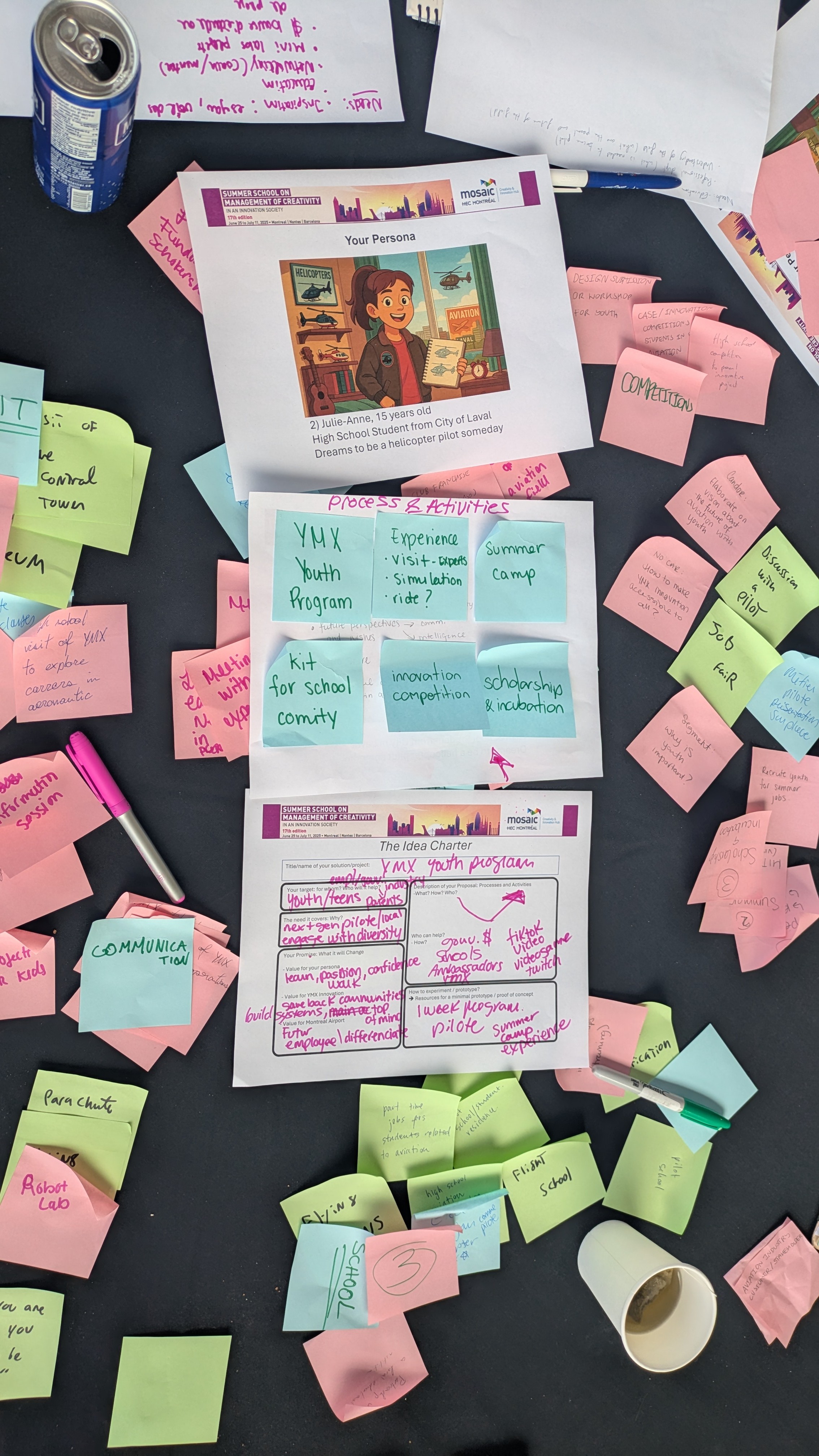 L’atelier qu’on nous a proposé était de réfléchir à comment le lieu (plutôt inhabité pour le moment) peut faire vivre l’innovation dans le transport aérien et réunir différentes communautés, voir même attirer différentes clientèles. Chaque équipe avait un persona et devait développer une stratégie pour attirer ce persona vers ce lieu. Au final, chaque équipe présentait sa solution à YMX, selon le persona établi, ce qui a généré plusieurs pistes pour le Centre afin d’atteindre son objectif. Ce genre d’atelier était super concret et pratique.