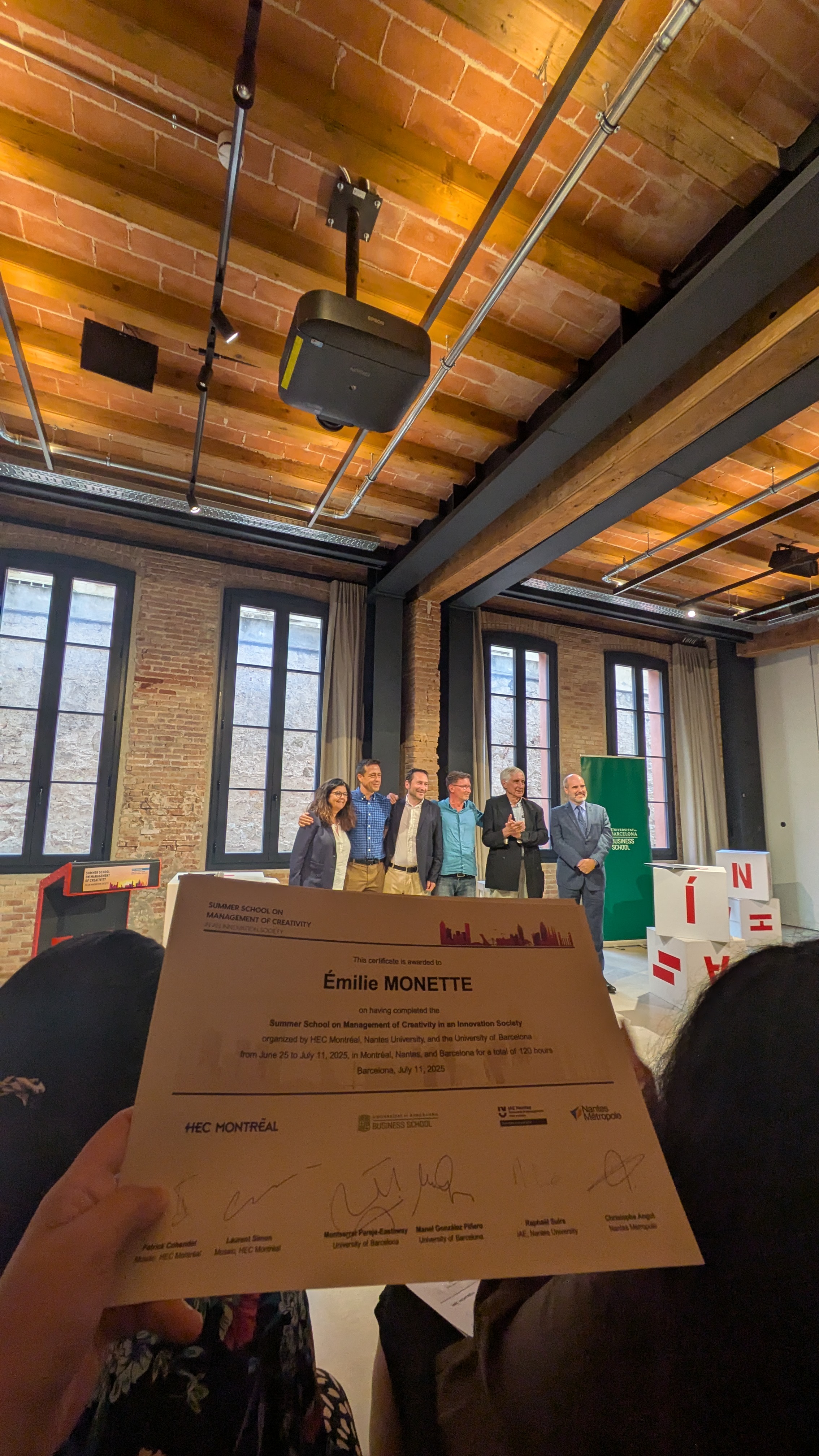 J’ai participé au programme de la 17e édition de l’École d’été en management de la créativité dans la société d’innovation, offert par HEC Montréal, l’Université de Nantes et l’Université de Barcelone, du 25 juin au 11 juillet 2025. Ce programme propose deux semaines et demie de rencontres, de conférences d’entrepreneurs et d’organisations, des ateliers pratiques et un défi à relever en équipe, qui est proposé par une entreprise partenaire du programme (il y en a eu 6 au total). Des étudiants, professionnels, chercheurs, entrepreneurs et professeurs font partie de chaque cohorte.