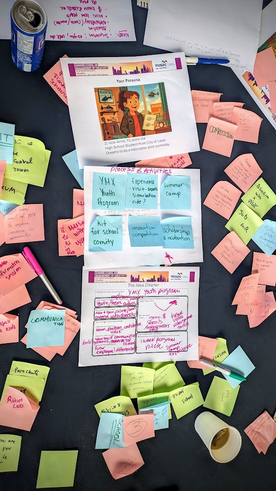 L’atelier qu’on nous a proposé était de réfléchir à comment le lieu (plutôt inhabité pour le moment) peut faire vivre l’innovation dans le transport aérien et réunir différentes communautés, voir même attirer différentes clientèles. Chaque équipe avait un persona et devait développer une stratégie pour attirer ce persona vers ce lieu. Au final, chaque équipe présentait sa solution à YMX, selon le persona établi, ce qui a généré plusieurs pistes pour le Centre afin d’atteindre son objectif. Ce genre d’atelier était super concret et pratique.