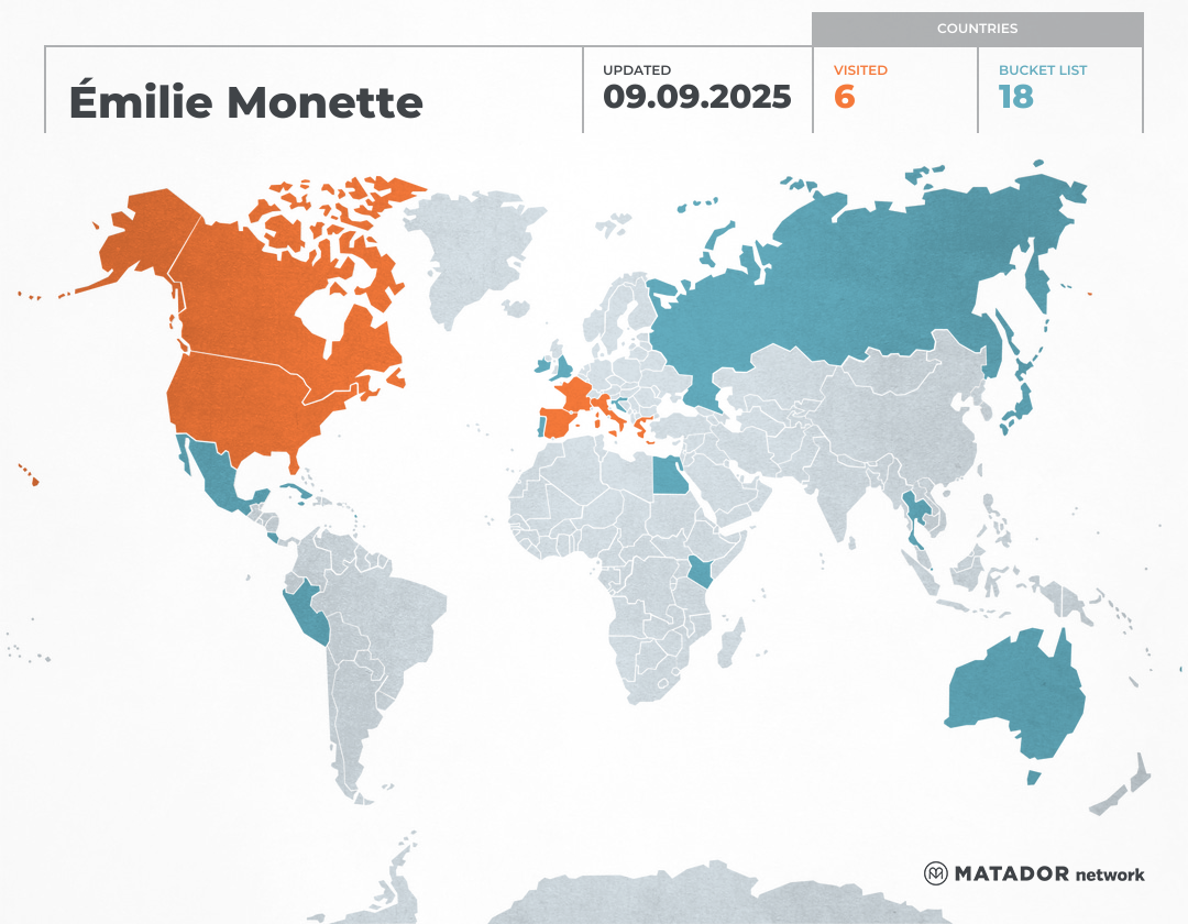 Sur ma bucket list : Australie, Costa Rica, Cuba, Angleterre, Fiji, Croatie, Jamaïque, Japon, Kenya, Mexique, Pérou, Portugal, Russie, Singapour et la Thaïlande entre autres