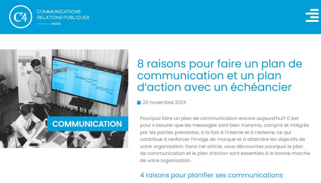 L’un de mes derniers mandats à la pige était de produire 3 articles de blogue pour l’agence C4 Communications afin de remettre cette dernière sur la map et de créer des publications médias sociaux pour C4 et OBNL 360 en octobre-novembre 2024, puisqu’elles étaient plutôt inactives sur le web depuis plusieurs mois.